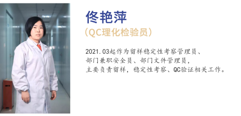 2021年,虽然佟艳萍已调岗到留样稳定性考察管理员,但仍然尽心尽力培养理化检验员。她在完成本职工作的同时,不怕辛苦、不怕困难,共培养出3名理化检验员。